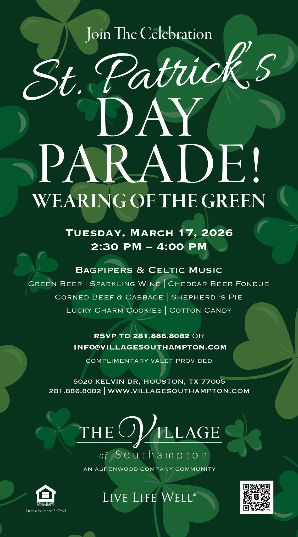 TUESDAY, MARCH 17, 2026 2:30 PM - 4:00 PM RSVP to 281.886.8082 or info@villagesouthampton.com