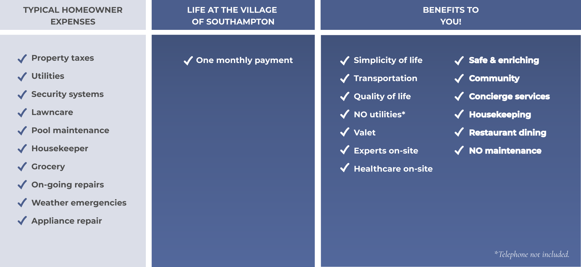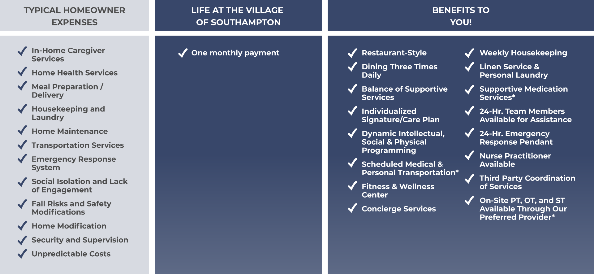 Affordability & All-Inclusive: The Village of Southampton offers a fixed monthly fee that covers most services like dining, utilities, lawn care, and concierge services, making it easier to budget and eliminating unexpected costs.